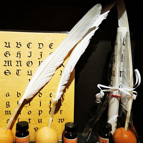 Set mit Tintenfläschchen, Feder, Federhalter und Buchstaben-Vorlagen zum Schreiben wie die Mönche zu Hause